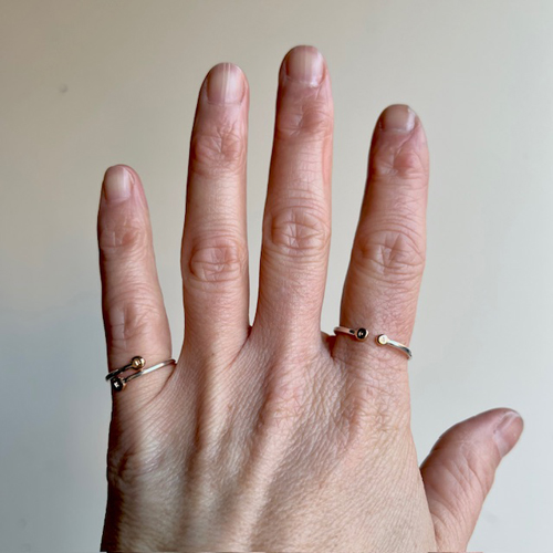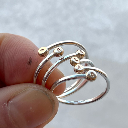 The silverring ends at both tips with a small gold nugget in recycled 18k gold. On these little gold nuggets, we can engrave letters or hearts for anyone who wants to make the ring extra personal.